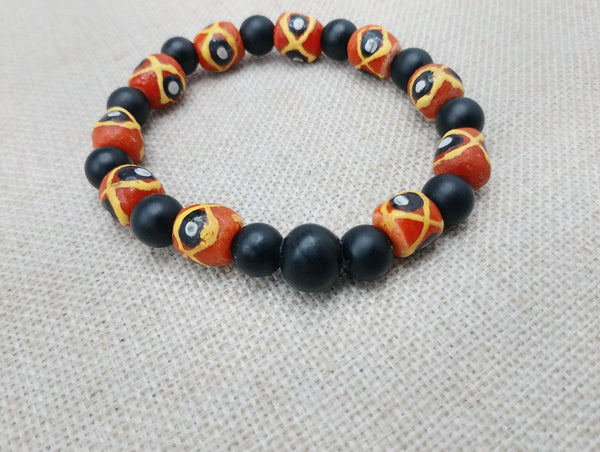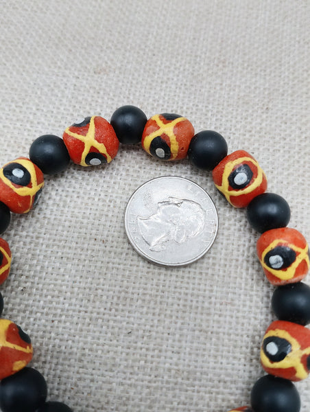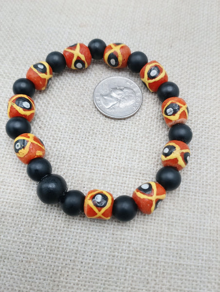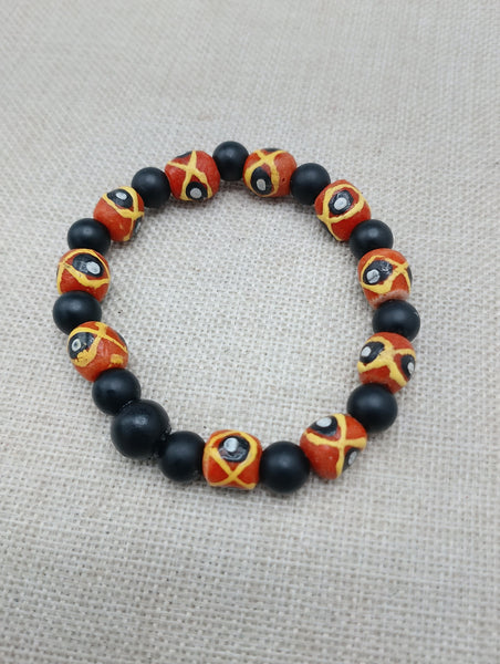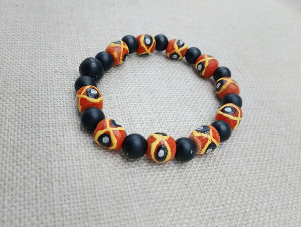 Elevate your style with our authentic African Krobo beaded bracelet. Handmade and hand painted with vibrant black, orange, and yellow beads, this stretch bracelet is a size 8 and designed to add a touch of ethnic flair to any outfit. Easy to put on, contact us anytime for any questions.