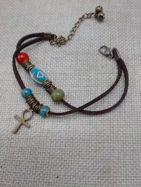 The Ankh bracelet is adjustable from 7 to 9 inches long. The bracelet closes with a clasp. The Ankh is antique bronze with pretty mix of colorful beads. Two colors are available the red and green. If you have any questions please feel free to contact us at anytime.