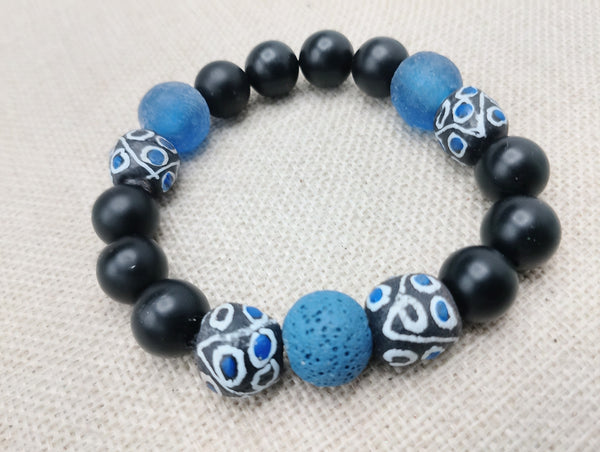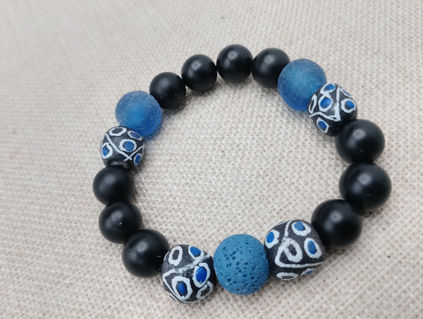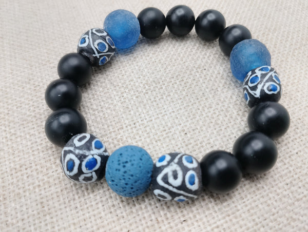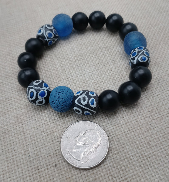Black Blue Beaded Bracelet Ethnic Handmade Unisex Jewelry Size 7