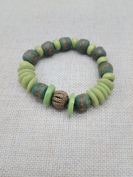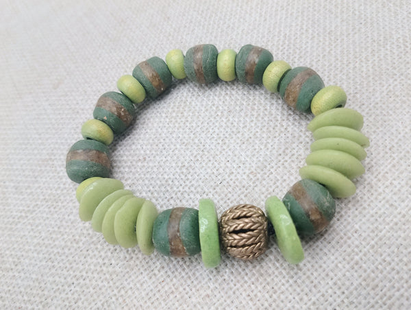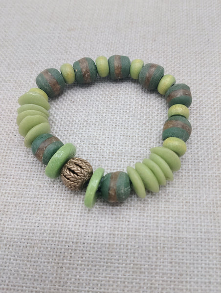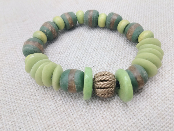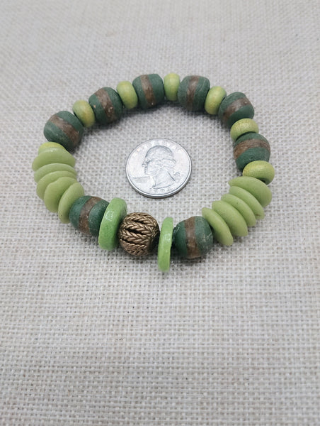 Expertly crafted using the lost wax technique, this beaded stretch bracelet is a perfect accessory for any outfit. Made with a mix of green Krobo, glass, and brass pendant, this size 7 bracelet exudes a unique and stylish look. Contact us for any inquiries.