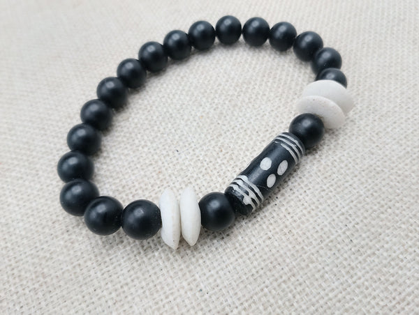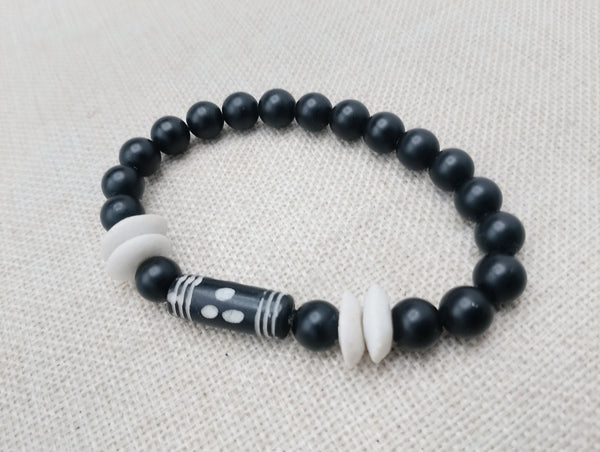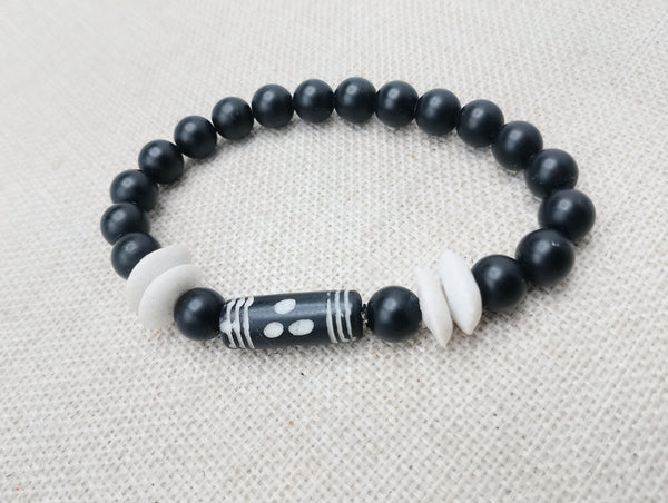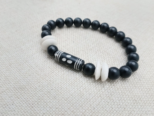 This handmade unisex bracelet features stretch beaded construction with African stone and beads. Its length of 7.5 inches makes it a versatile and comfortable accessory. Contact us for any inquiries.