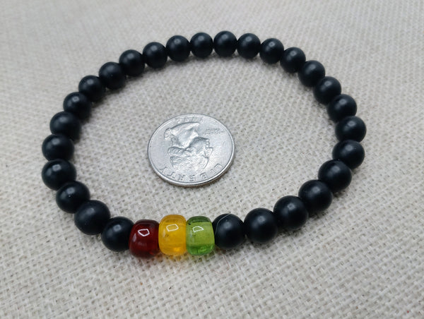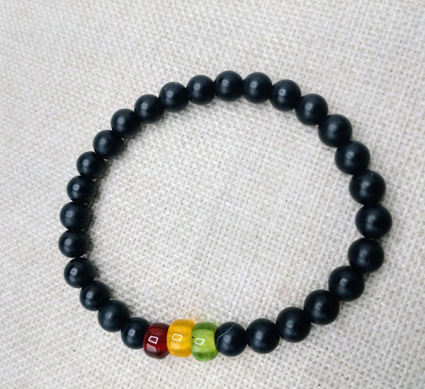 Expertly handcrafted in Ghana, this vibrant stretch bracelet features a unique combination of red, black, and green beads. Measuring at 8 inches, the bracelet is perfect for any wrist size. Add a touch of African jewelry to your wardrobe while supporting traditional craftsmanship.