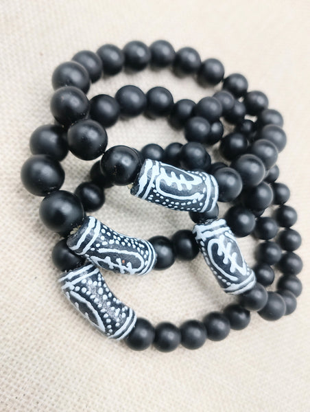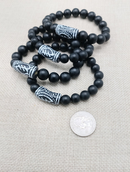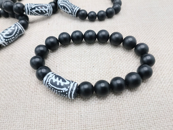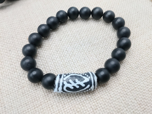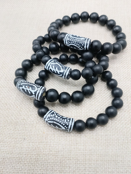 The African Gye Nyame handmade stretch bracelet is a available in 7 to 8 inches long. The beaded bracelet has stone, hand painted and handmade African beads. If you have any questions please feel free to contact us at anytime.