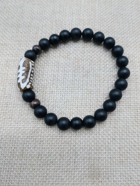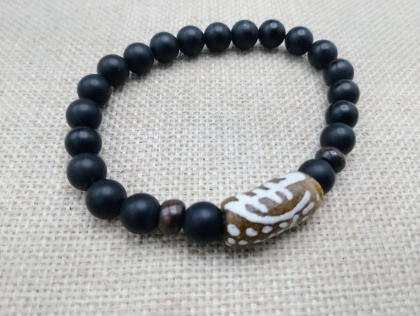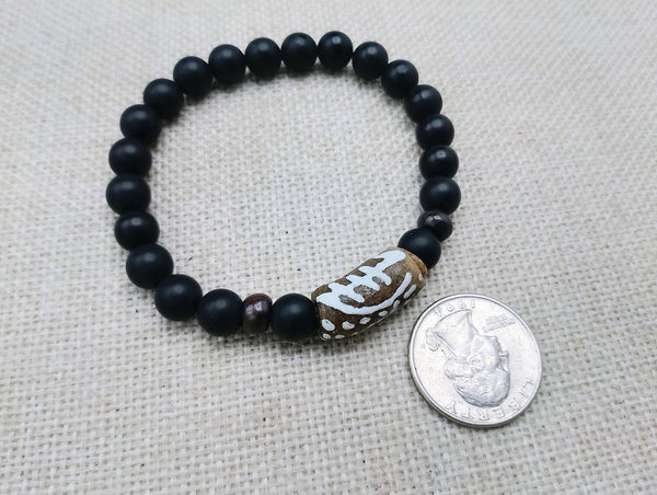 This 7-inch stretch bracelet features black and hand-painted African beads, adorned with the powerful Gye Nyame Adinkra symbol. Expertly crafted, this beaded bracelet combines style with cultural significance. Perfect for both men and women. Contact us with any inquiries. Choking hazard.