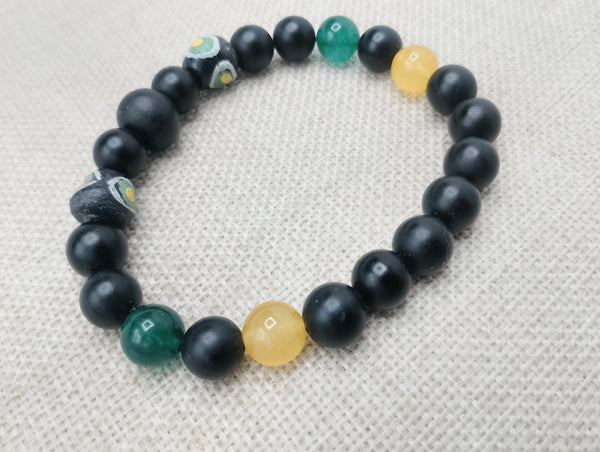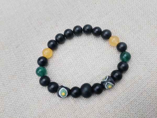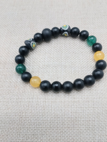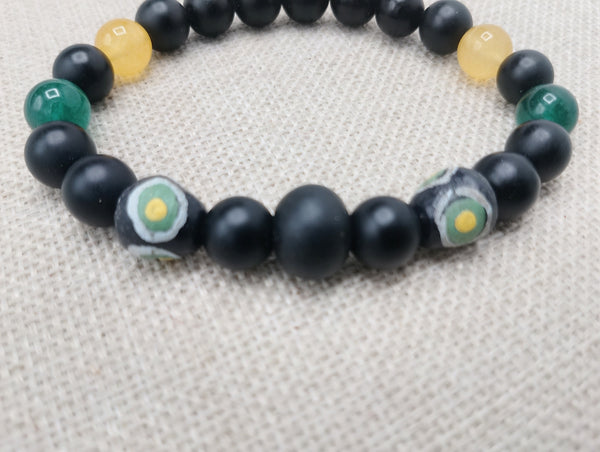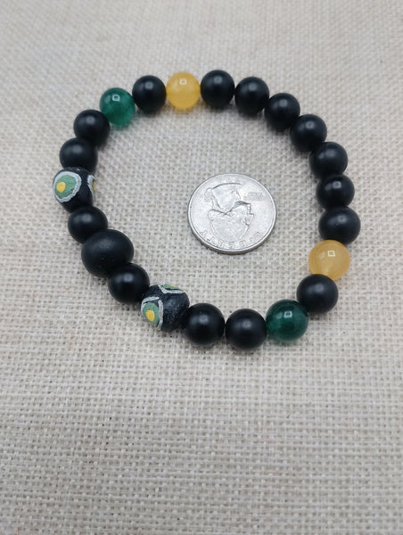 "Enhance your style with our Men Bracelets Beaded Black Yellow Green, featuring the iconic black, yellow, and green colors of Jamaica's flag. Handcrafted using stone and beads, this 7.5-inch bracelet adds a touch of culture and individuality to any outfit. Please note, due to small parts, this item may pose a choking hazard."