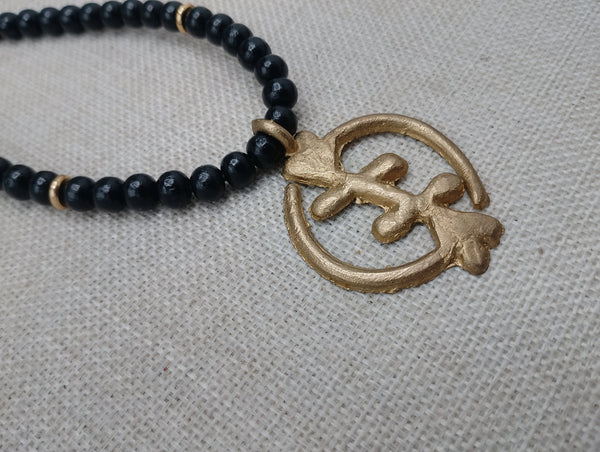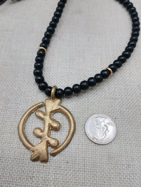 The necklace is approximately 34 inches long. It closes with a clasp. It is beaded with black and gold wooden beads. The pendant is a authentic African piece using the lost wax technique as this mena it is not a perfect made and not made by machine. It is vintage. The Gye Nyame symbol is one of the most popular Adinkra symbols used in jewelry, fabric and everyday items. Gye Nyame means "except for God". If you have any questions please feel free to contact us at anytime .