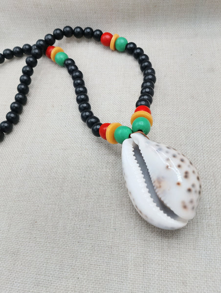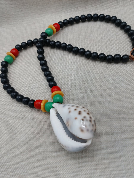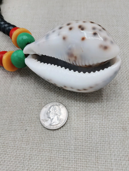 The necklace has a whole large Cowrie Shell. The large Cowrie Shell is approximately 3 inches long. It is beaded with large wooden beads which are red, black, yellow and green. It is 32 inches long on a cord and goes over the head. If you have any questions please feel free to contact us at anytime.