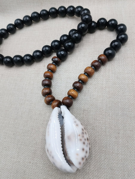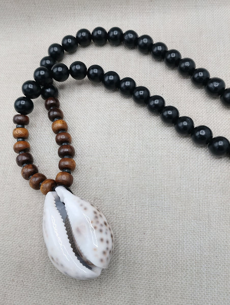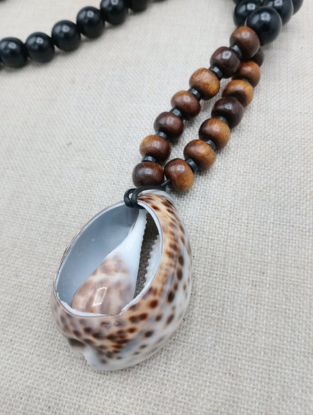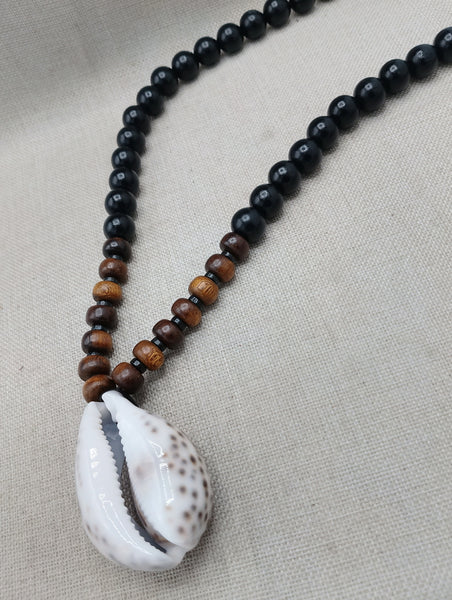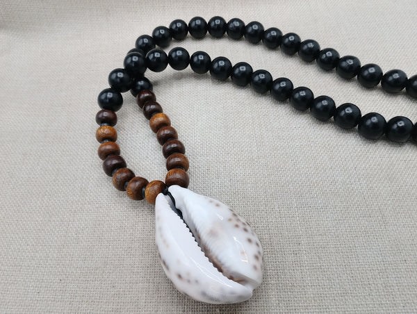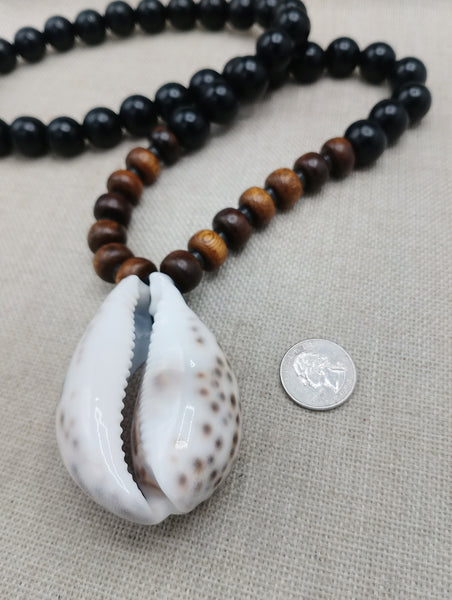 Introducing our unique Cowrie Shell pendant necklace! Measuring at 3 x 2 inches, this eye-catching pendant is made on a 30 inch black cord, allowing for easy wear over the head. Add some natural beauty to your look with this must-have accessory. Contact us with any questions. Choking hazard.