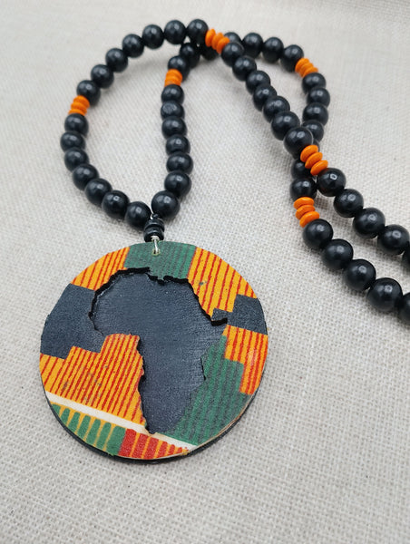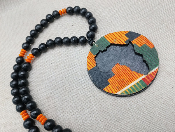 "Enhance your style with our unique African kente pendant necklace. Measuring 3 inches in diameter and 26 inches in length, it features a stunning mix of black and orange wooden beads and a convenient clasp closure. Embrace the cultural significance and impeccable craftsmanship of this authentic piece. Contact us with any inquiries."