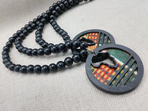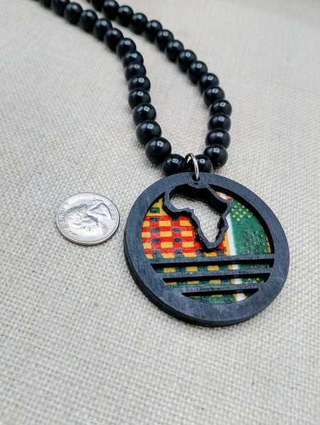Elevate your style with our unique African Necklace Kente Jewelry, featuring a 2.5 inch round, hand painted pendant showcasing the original design "The Blacker the Berry". Handmade with traditional African kente and complemented by wooden black beads, this necklace is approximately 24 inches long. Contact us for custom lengths. Expertly crafted for the fashion-forward individual.