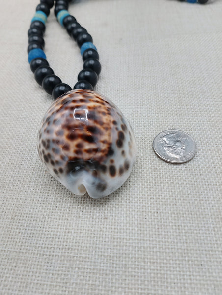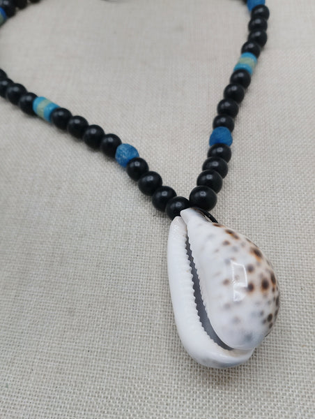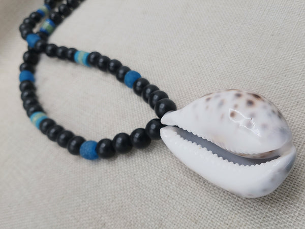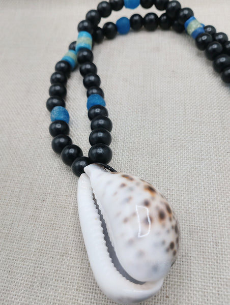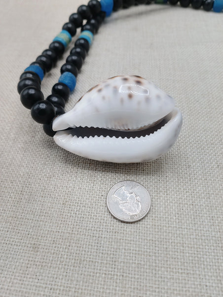 Add a unique touch to your style with our African Necklace. Handmade with wood and African Krobo beads, this 26-inch beaded necklace features a large, whole Cowrie Shell measuring 3 x 2 inches. Perfect for any occasion, contact us with any questions. Keep away from babies and children.