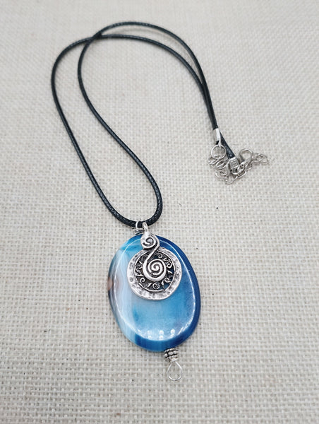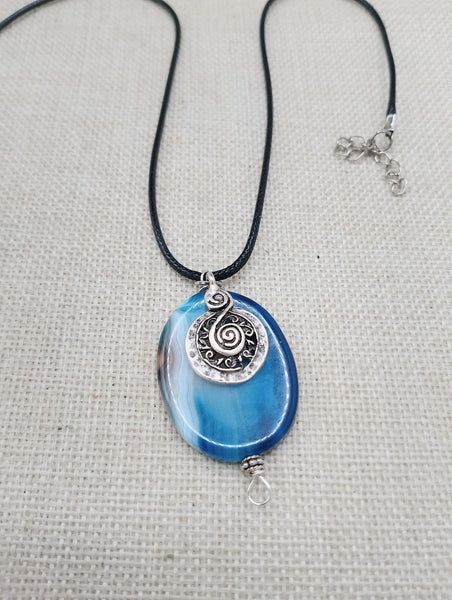 The necklace is a blue agate striped pendant with a silver accent. The pendant is approximately 1.75 inches long. The necklace is approximately 18 inches long. It has a extender. If you have any questions please feel free to contact us at anytime.