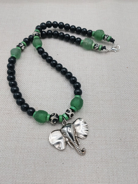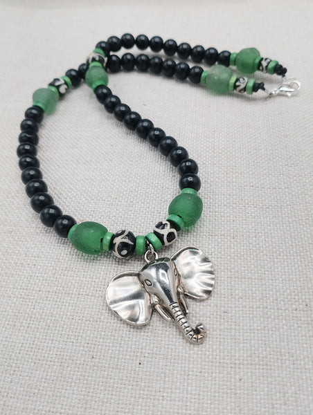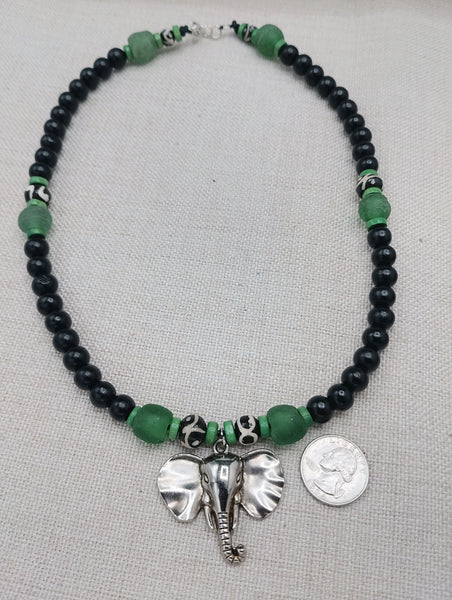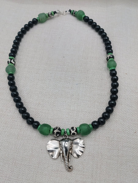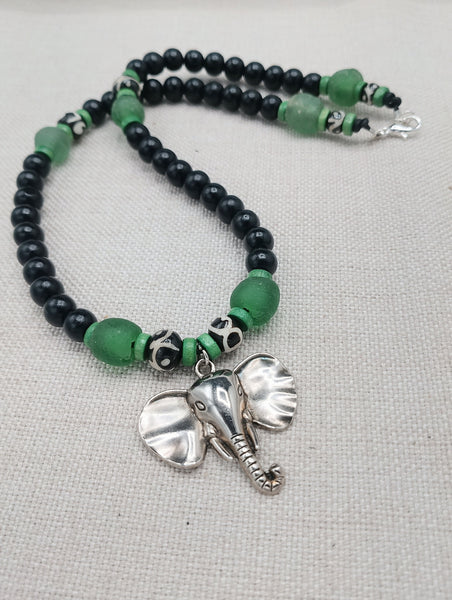 Expertly handcrafted with a 1.5 inch elephant charm pendant, this 22 inch necklace is adorned with beautiful black and green beads. Elevate any ensemble with this unique and charming piece. For any inquiries, our team is available to assist you at any time.