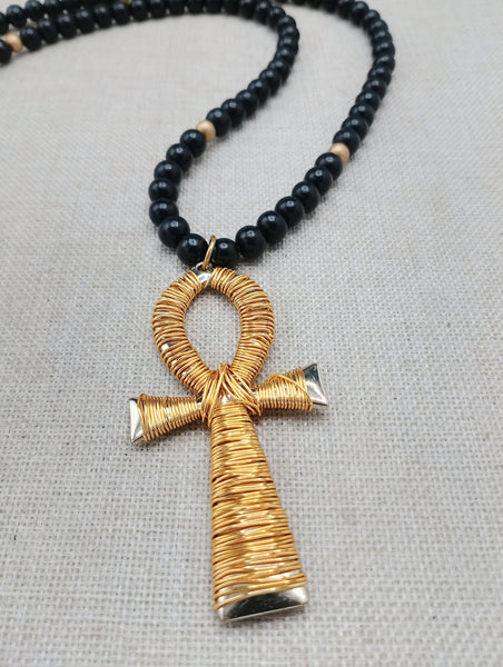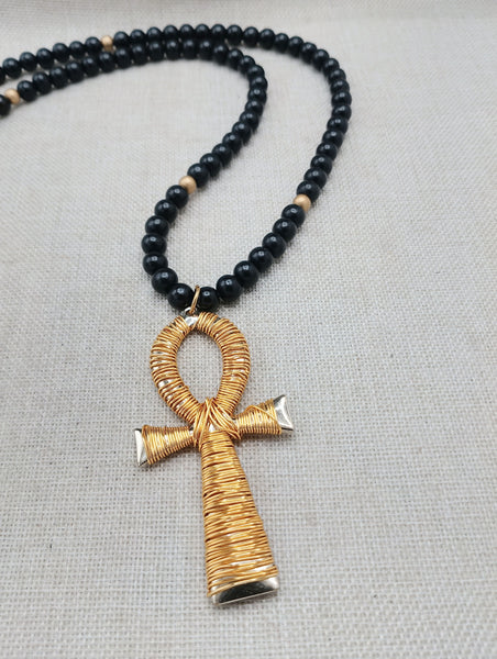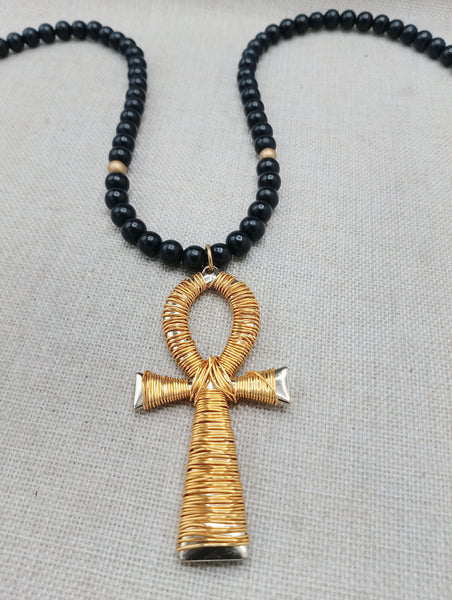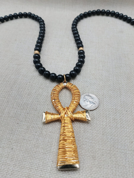 The necklace is a wire wrapped gold tone Ankh. The Ankh is approximately 4 inches long. The necklace is approximately 29 inches long and closes with a clasp. It is beaded with wooden black and gold tone beads. If you have any questions please feel free to contact us at anytime.