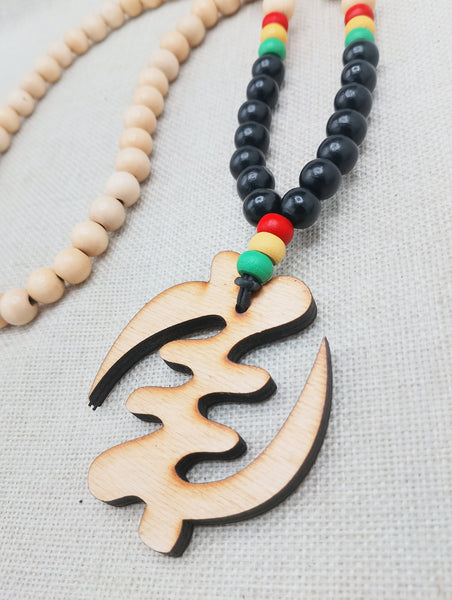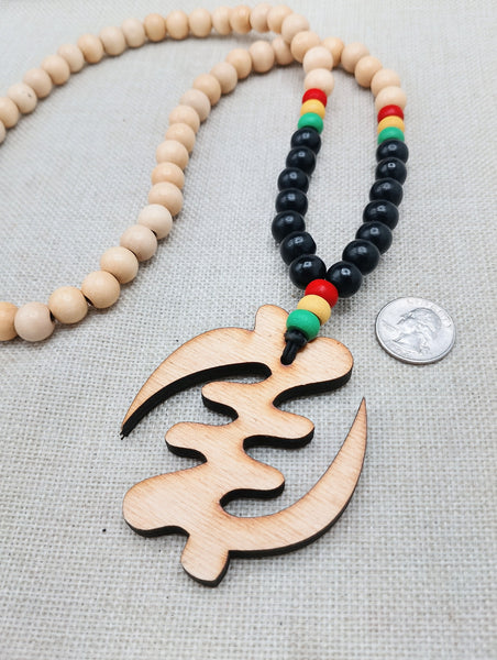Uniquely crafted from wood, this Gye Nyame beaded necklace is a symbol of faith and tradition. The 3x3 inch pendant is intricately designed and paired with a 28 inch long necklace adorned with red, yellow, and green accents. The perfect accessory for any man seeking a touch of Ghanaian culture. Contact us for more information.