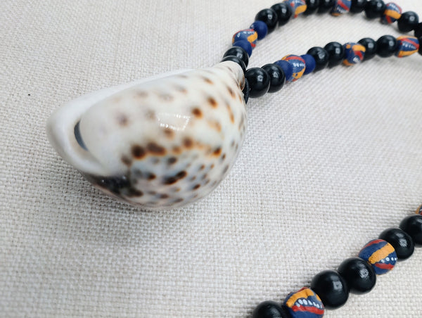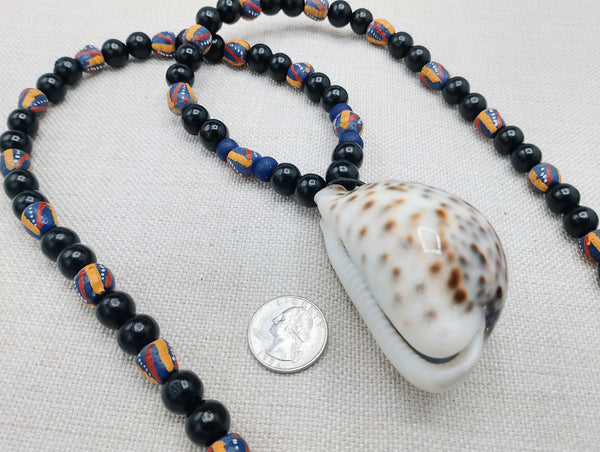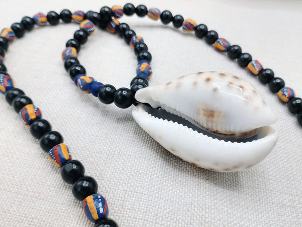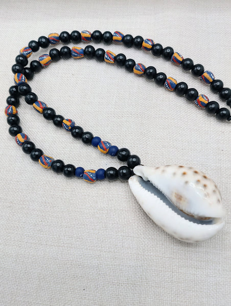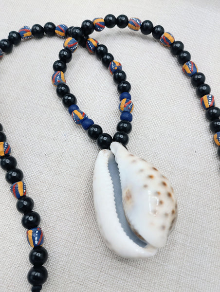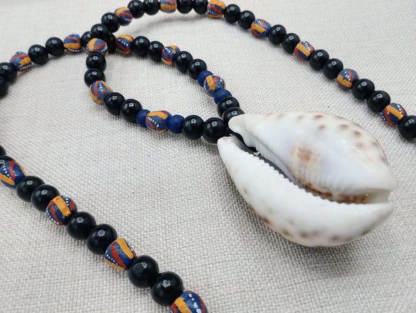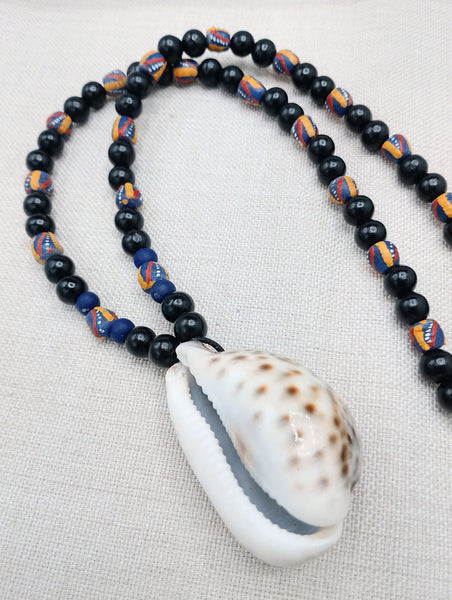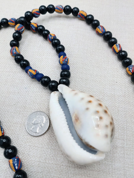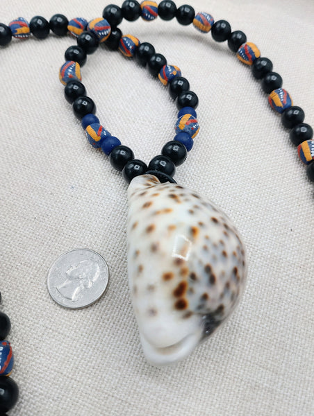 Take your style game to the next level with our Large Cowrie Necklace for men. Handmade with African painted beads, this statement piece features a 3-inch whole long Cowrie pendant on a 32-inch wood necklace. Perfect for adding a touch of cultural influence to any outfit. Contact us with any inquiries.