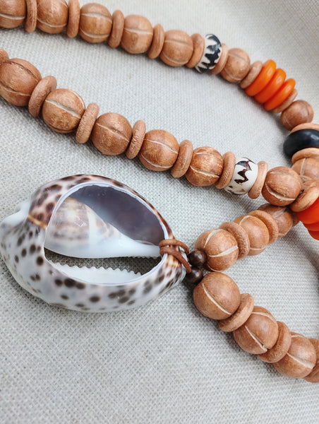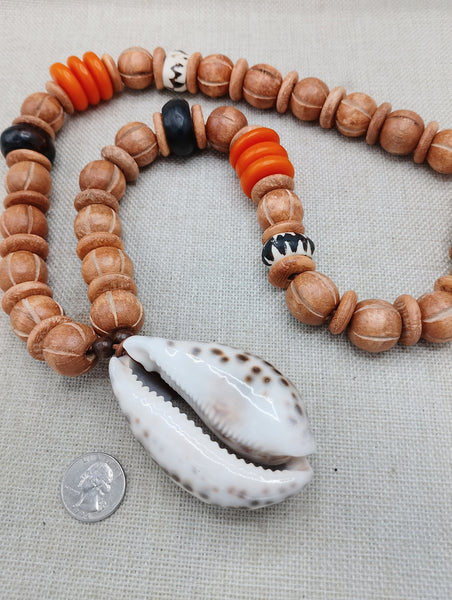 Large Cowrie Shell Necklace Men Jewelry Beaded Orange Wood Brown Gift Handmade