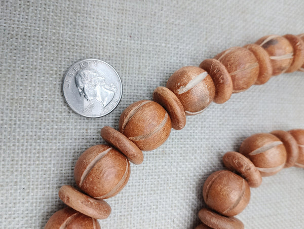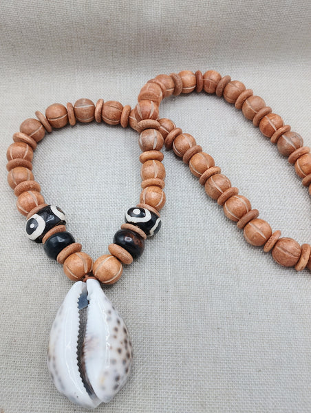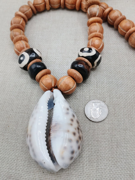 The large Cowrie Shell is halved and is approximately 3 inches long. The necklace has large carved beads and handmade African beads. The necklace is approximately 35 inches long. It goes over the head. It is on a thick cord. If you have any questions please feel free to contact us at anytime.