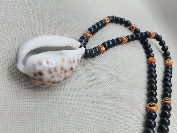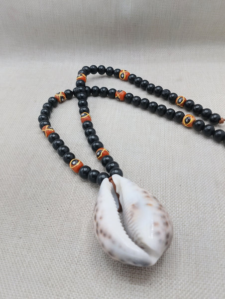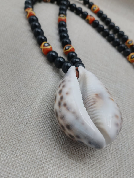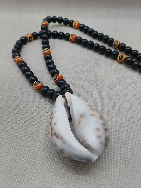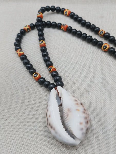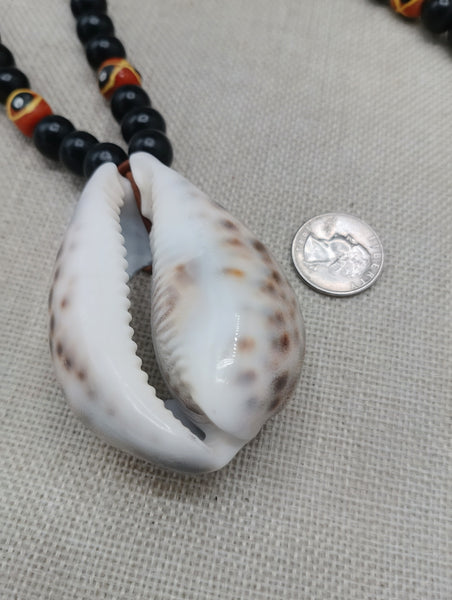The necklace is approximately 30 inches long and the large Cowrie halves shell is approximately 3 inches. The necklace closes with a clasp. It was beaded with wood and handmade Krobo African beads which are handmade and hand painted. If you have any questions please feel free to contact us at anytime.