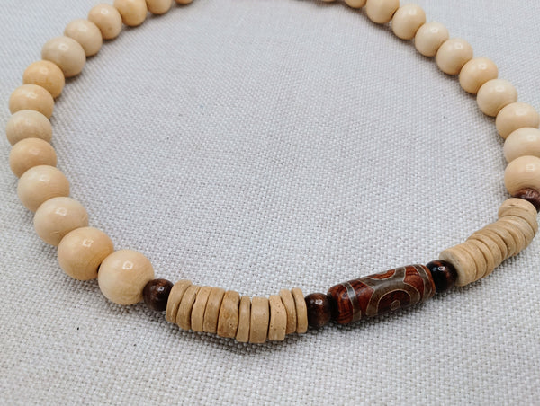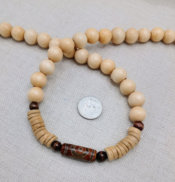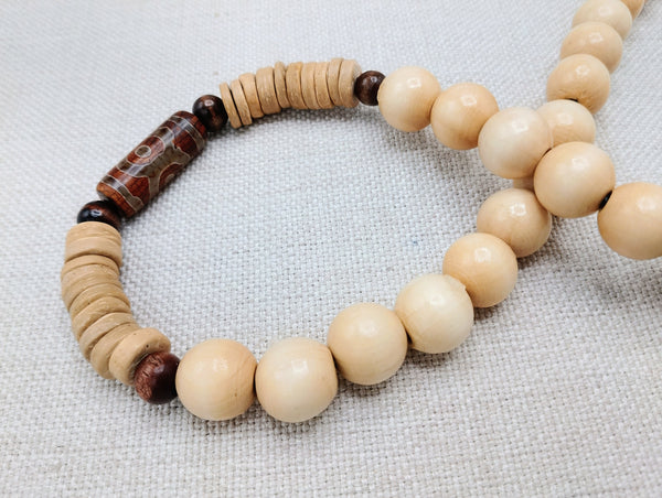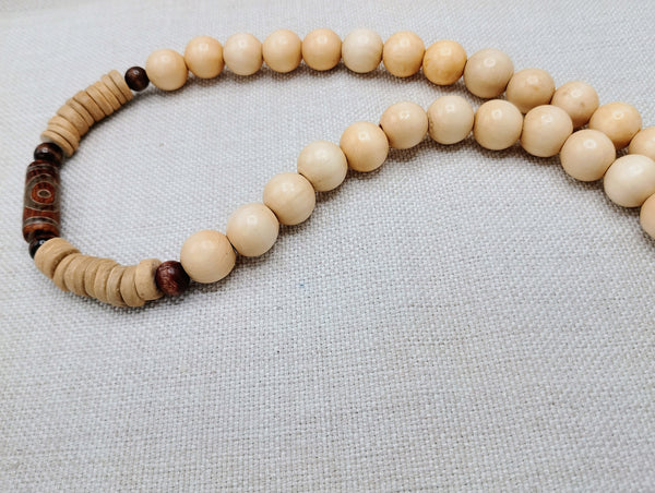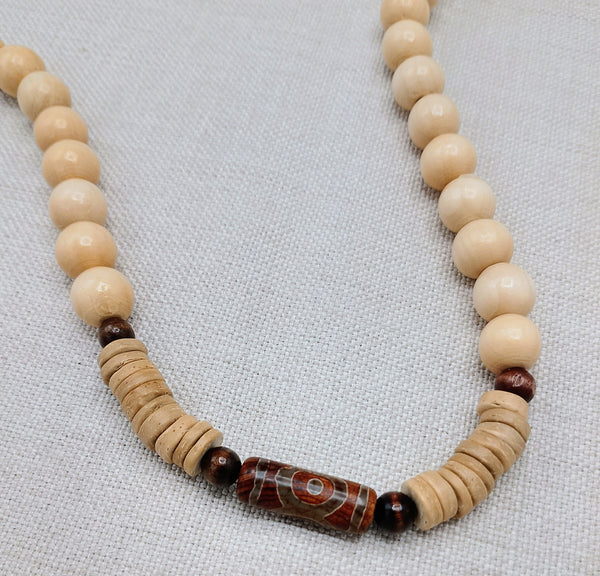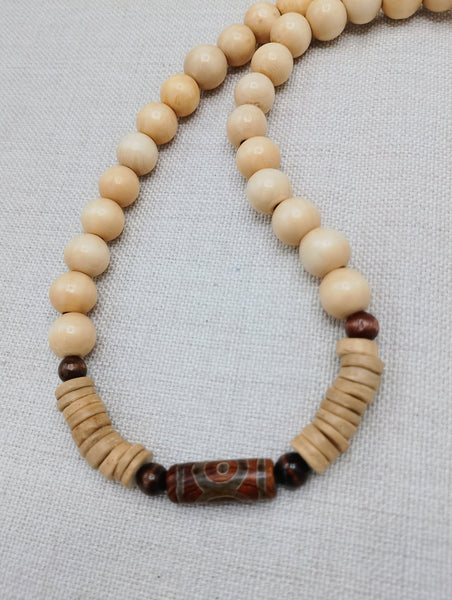 This 22 inch necklace features a stunning agate stone bead at its center. The clasp closure ensures secure wear. Elevate your style with these unique wood, carved and ethnic beads. Contact us with any inquiries.