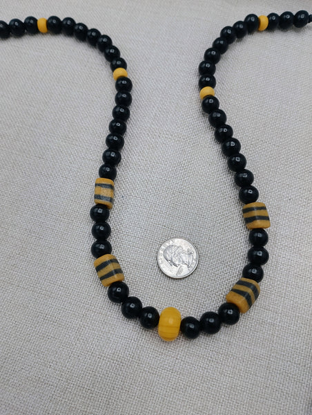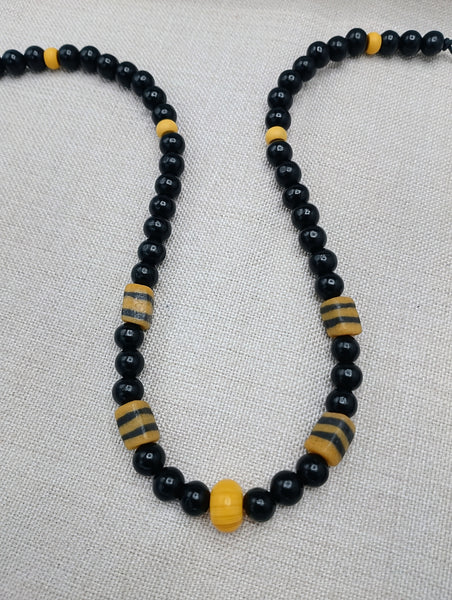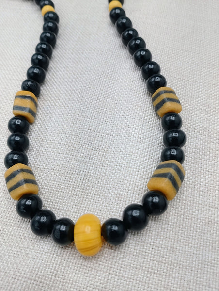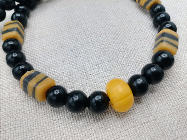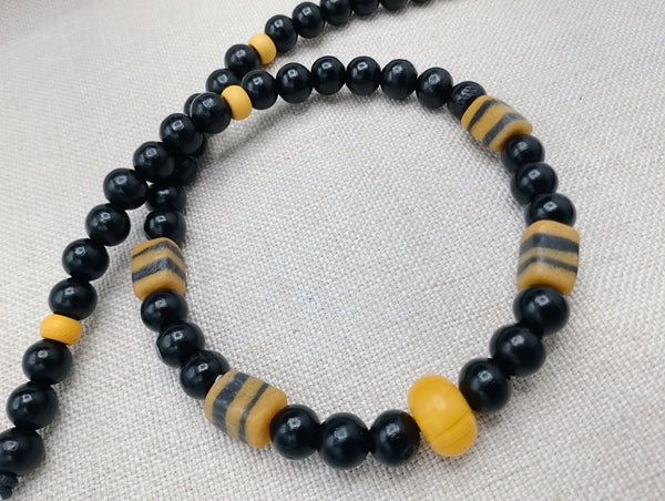 Expertly crafted with a mix of wood, copal, and African Krobo beads, this 24-inch necklace is a statement piece for men. The secure clasp ensures a comfortable fit while adding a touch of ethnic flair. Contact us with any inquiries.