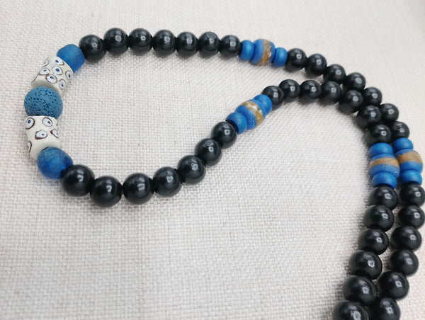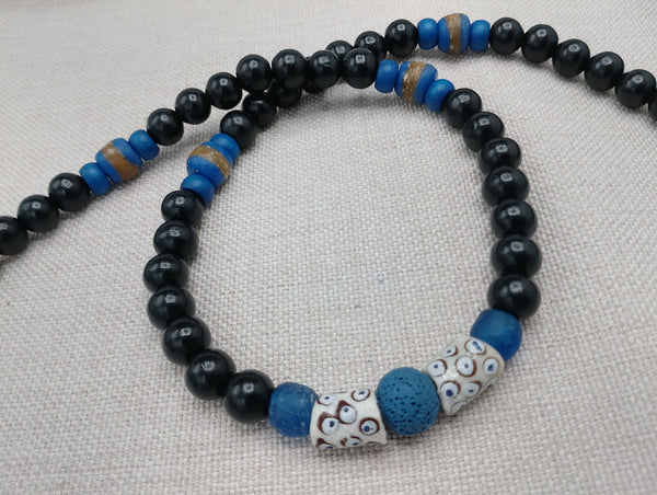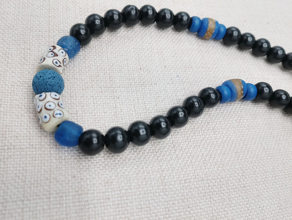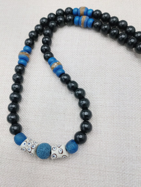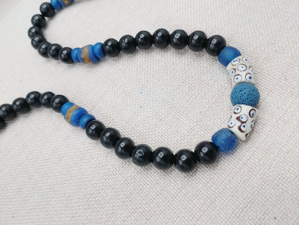 This handmade necklace features blue, black, and white beads and measures 24 inches long. It closes with a clasp for secure wear. Perfect for adding a touch of color and style to any outfit. Makes a great gift idea for the fashion-conscious man.