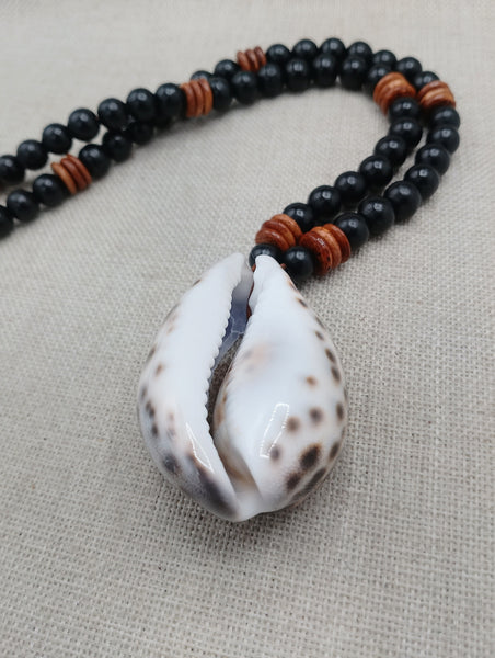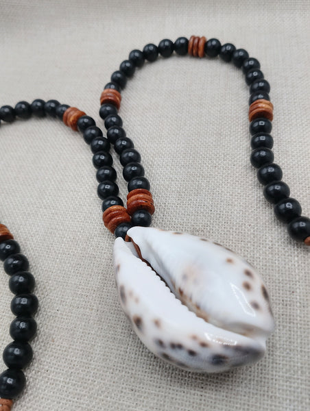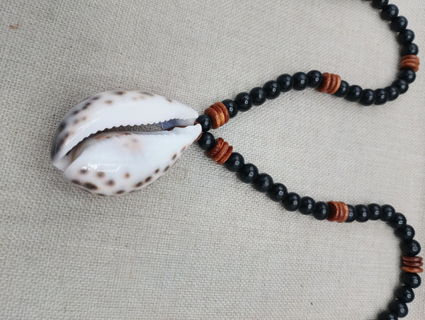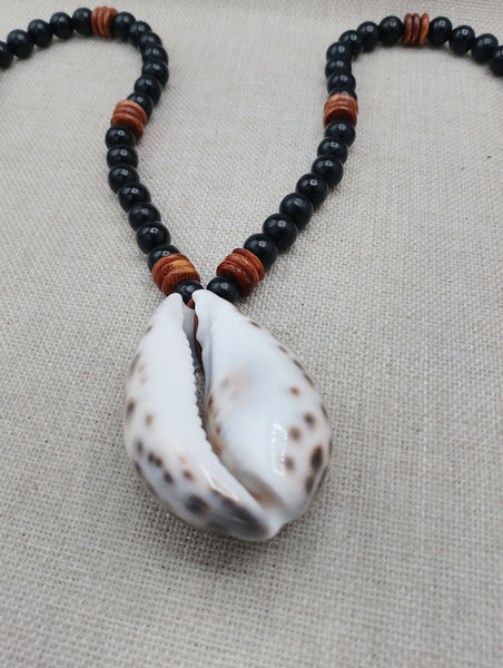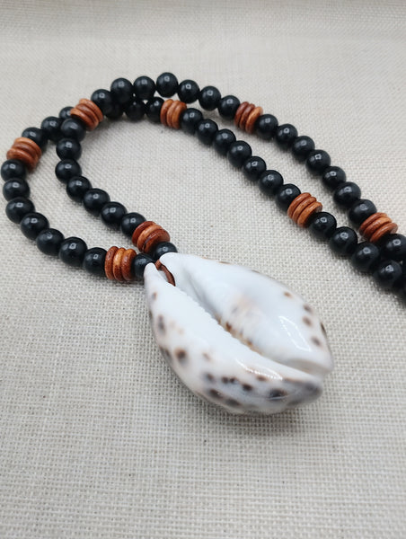 This 28 inch necklace is handcrafted with black and brown wooden beads, each measuring approximately 10-12 mm. The focal point is a 3 x 2 inch Cowrie Shell pendant, making this piece a unique and eye-catching addition to any outfit.