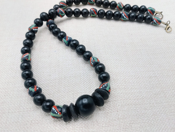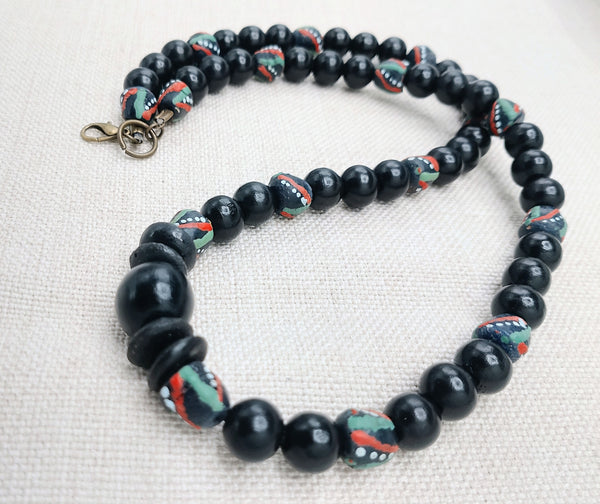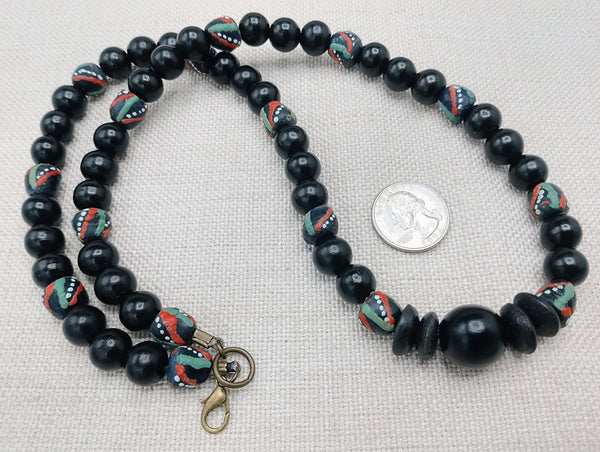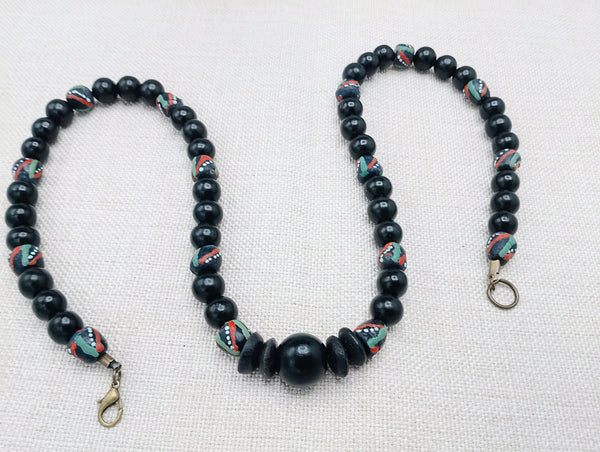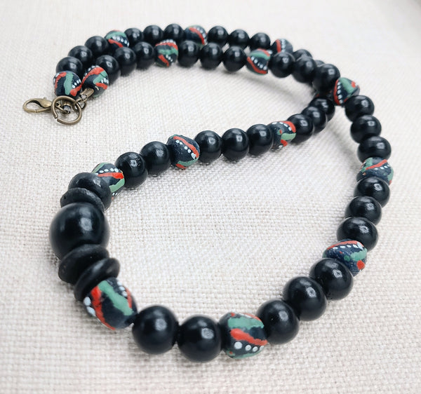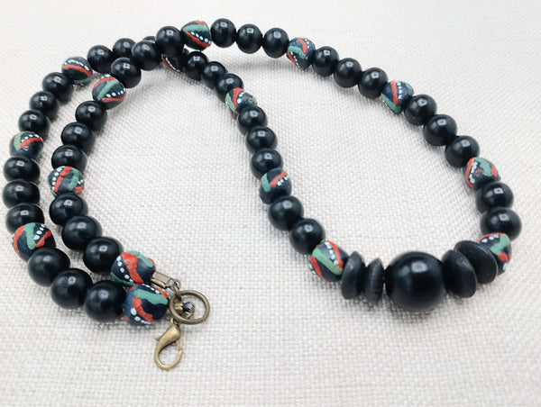 This men's necklace features a unique and stylish design, incorporating pan African colors of black, green, and red. Crafted with a mix of wood and handmade painted beads, it measures about 25 inches in length and securely closes with a clasp. A great addition to any outfit, perfect for those who appreciate cultural jewelry.