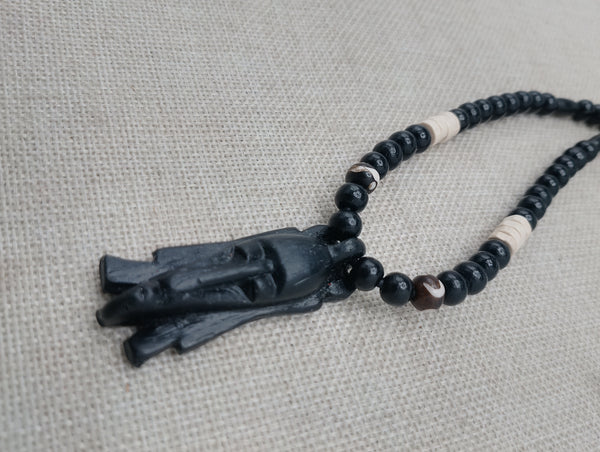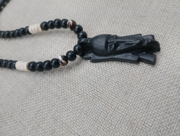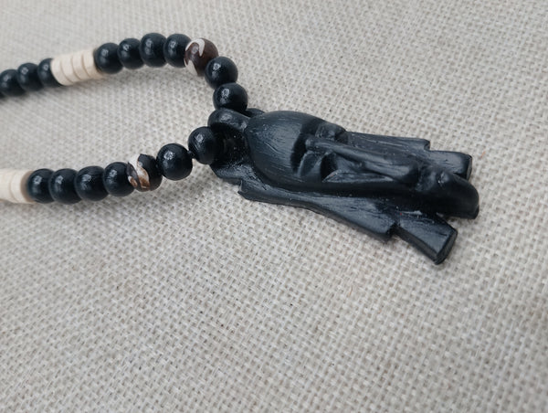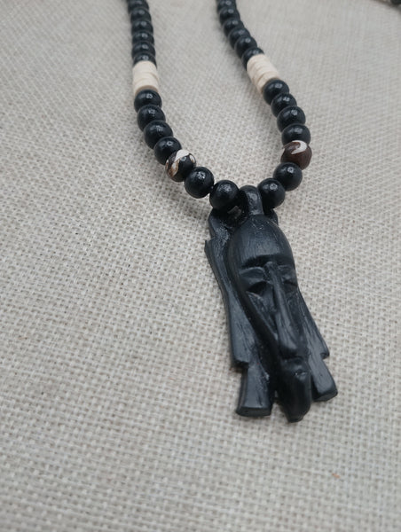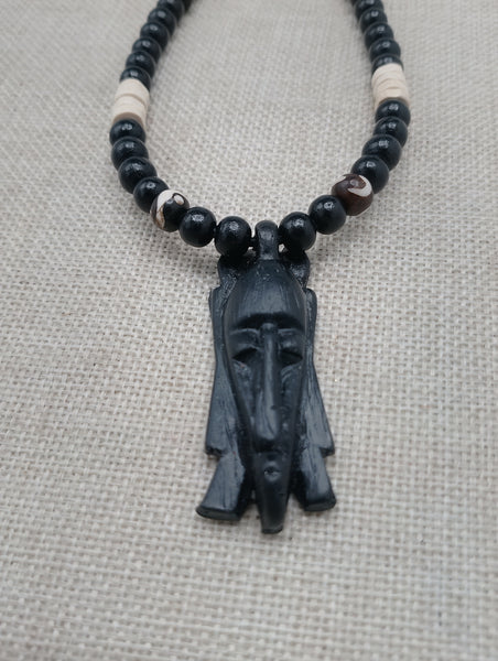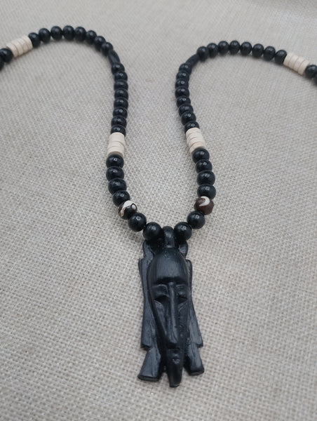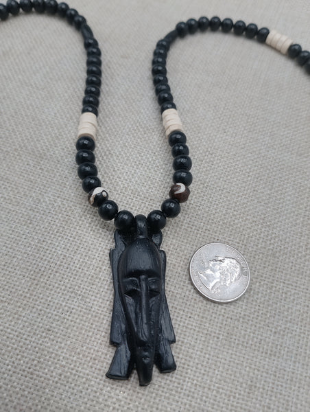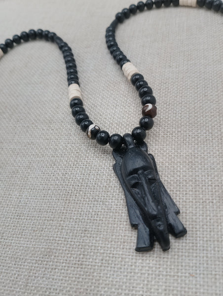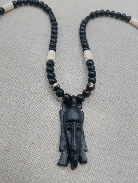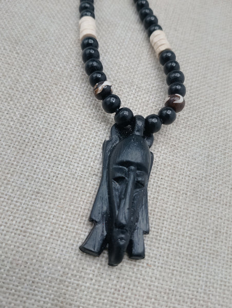 Enhance your outfit with our African mask pendant necklace. Measuring 2 inches long, this black pendant features intricately carved face features. The 20 inch beaded necklace includes handcrafted African beads in black and light beige, and closes with a clasp for easy wear. Contact us with any questions. *Choking hazard for young children.