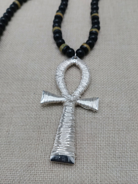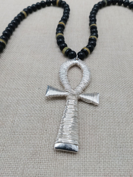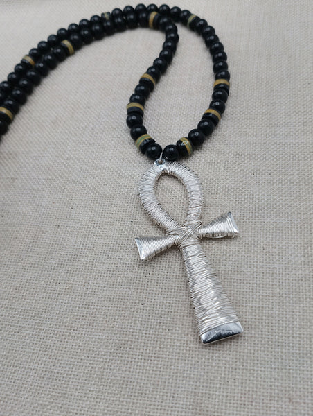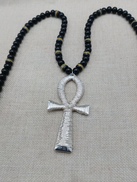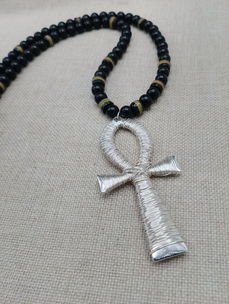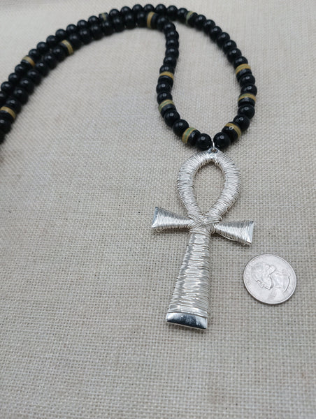 This statement necklace draws inspiration from both Jamaican and Egyptian cultures, featuring a silver Ankh pendant carefully wrapped in silver wire. Measuring at approximately 4 inches long, it is adorned with vibrant yellow and green beads, adding a touch of color to any outfit. Contact us anytime for further inquiries.
