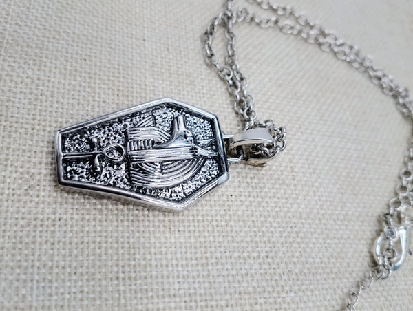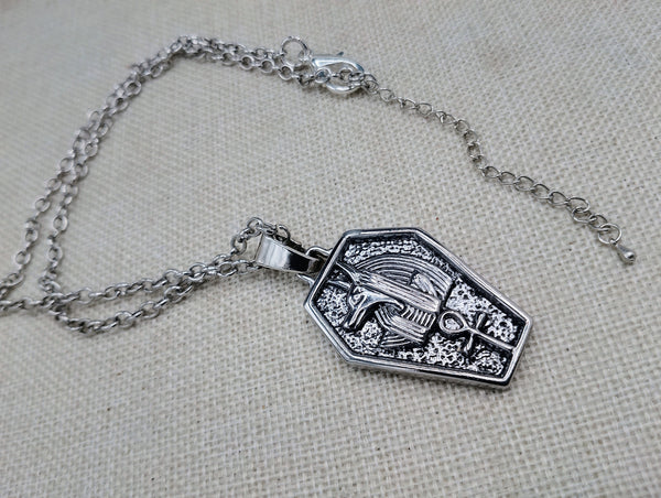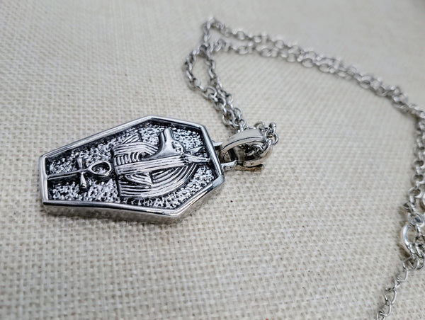 This stunning silver Egyptian necklace features a 2 inch long Anubis Coffin Pendant. The chain is adjustable from 18 to 20 inches, giving you the perfect fit. Show off your love for ancient Egyptian culture with this elegant and versatile piece of jewelry. Contact us with any inquiries.