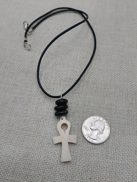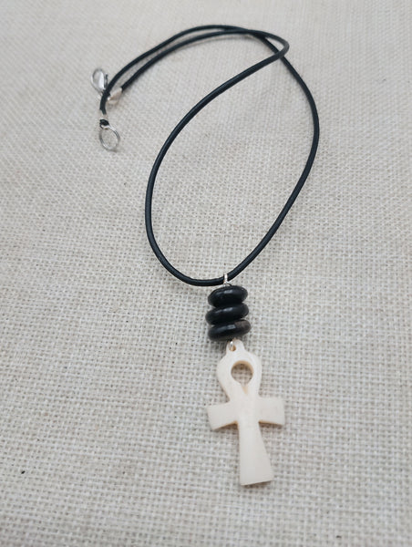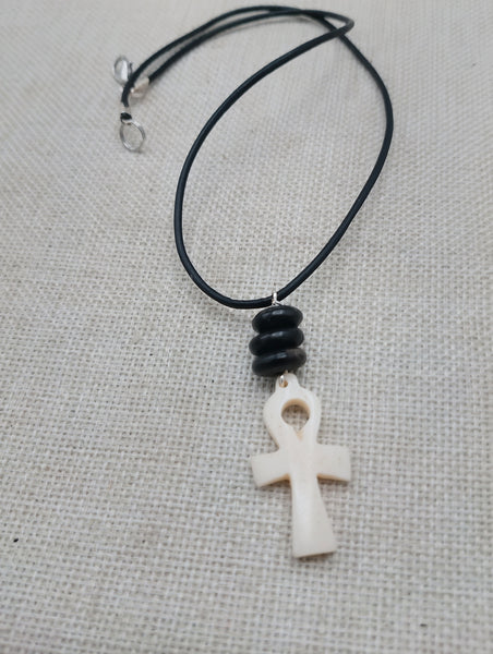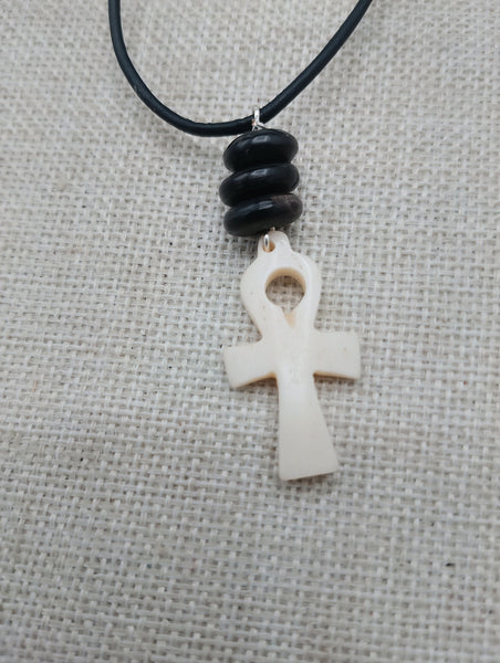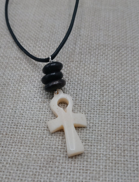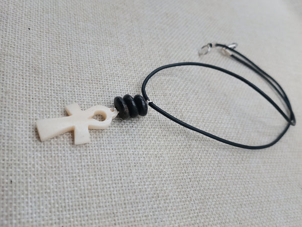 The necklace features a pens of the Ankh, and ancient Egyptian symbol for life and eternal life The pendant appears to be made from a material like bone, possibly buffalo bone, which is a common material for such carved items. The pendant is on a black cord with several black beads.