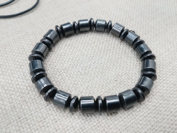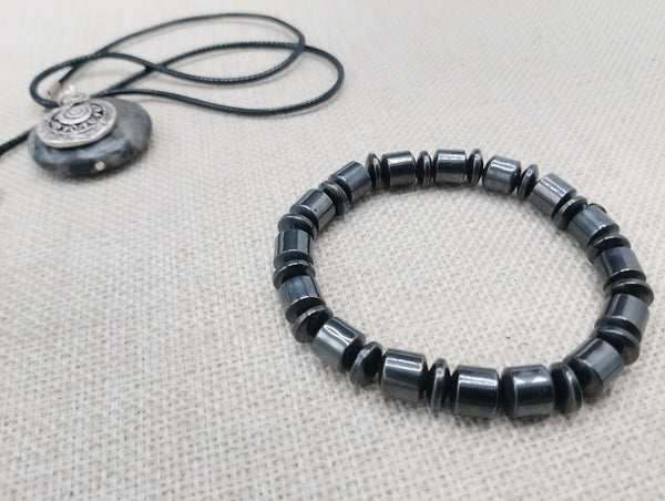 This Stone Necklace Hematite Jewelry Set features a beautiful necklace and bracelet, made with Hematite beads for a sleek and elegant look. The adjustable necklace is 16 to 18 inches long and includes a stunning dark stone and silver spiral accent. A perfect addition to any outfit. Please contact us with any questions.