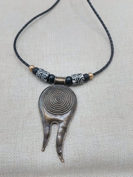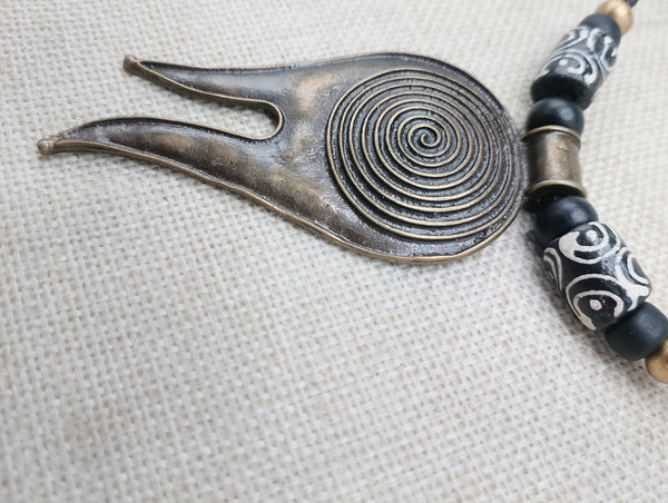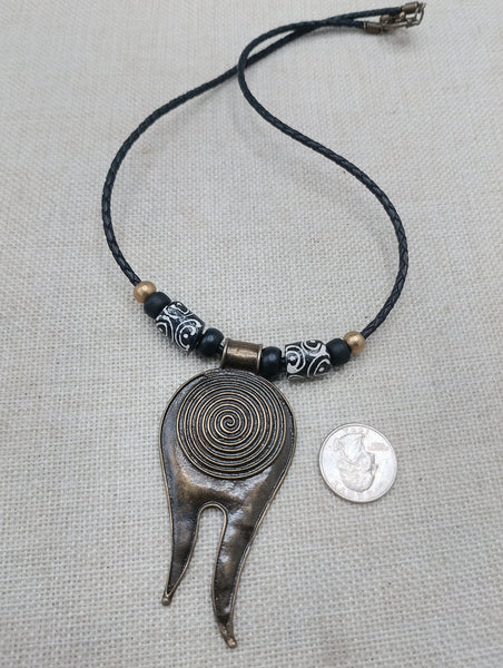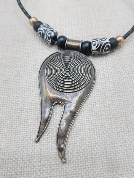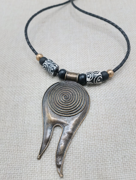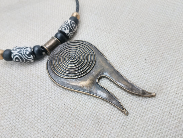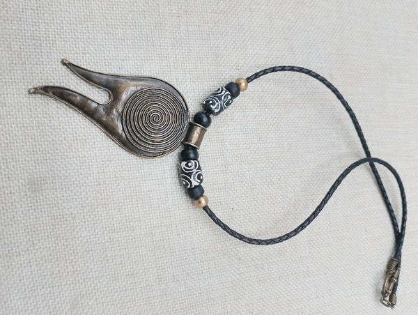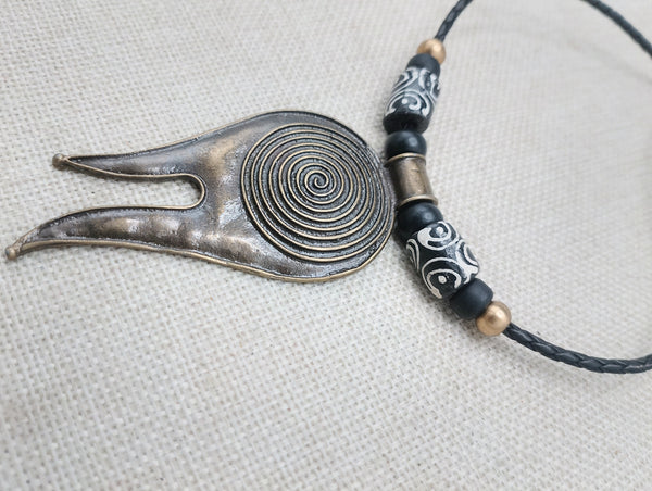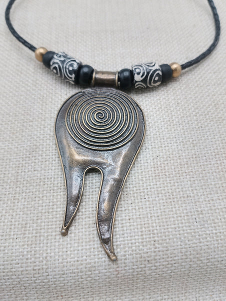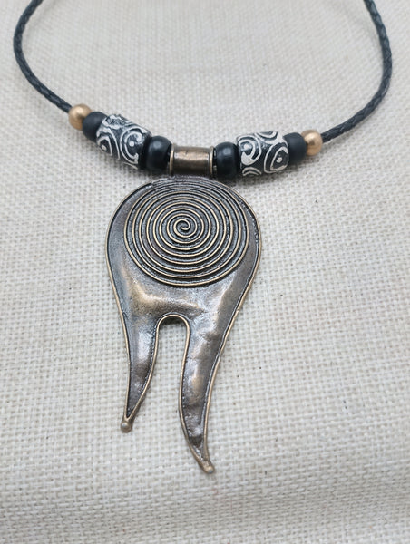 Indulge in the unique and interesting Tribal Necklace Swirl. With a 3.5 inch pendant, it features an intricate swirl design and is beaded with handmade Krobo beads. Hangs on a 20 inch braided leather necklace for a statement piece. Contact us with any inquiries. Choking hazard for babies and young children.