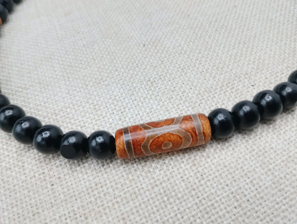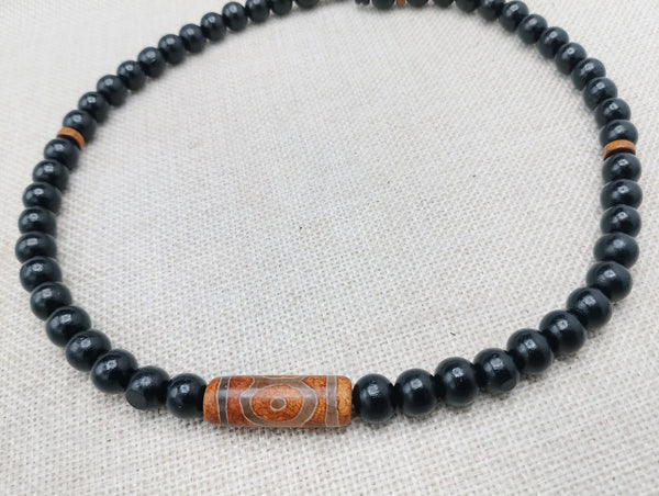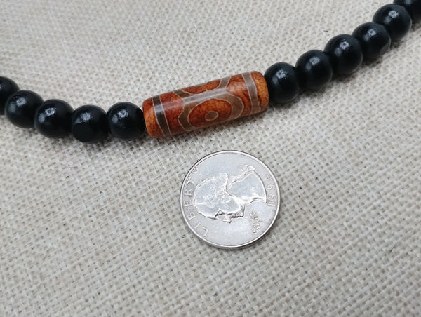 This 20-inch men's necklace features a beautiful agate stone in the center, surrounded by black wooden beads and a clasp closure. Add a touch of style to any outfit and stand out from the crowd with this stunning jewelry. Contact us with any questions. Choking hazard for young children.