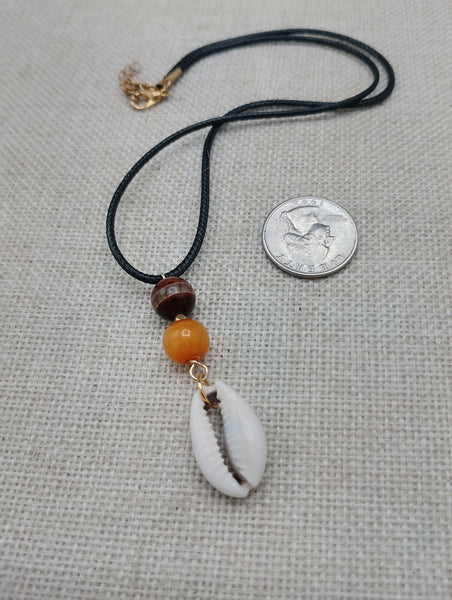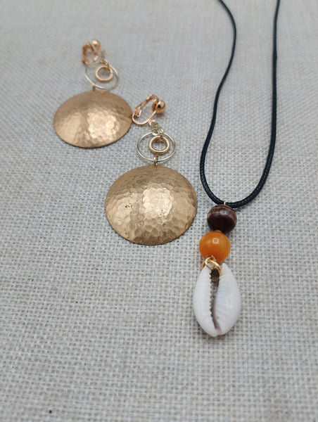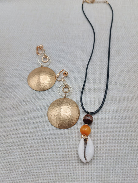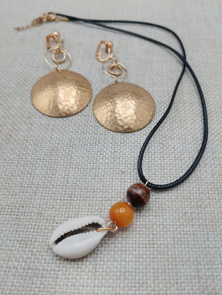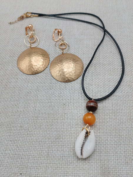 Upgrade your jewelry collection with our beautiful women's jewelry set! The beaded necklace features stunning agate and glass beads, with a cowrie dangle that adds a touch of elegance. The adjustable length (16-19 inches) ensures a perfect fit while the round hammered gold tone earrings (2.4 inches) add a touch of sophistication. Contact us for pierced options.