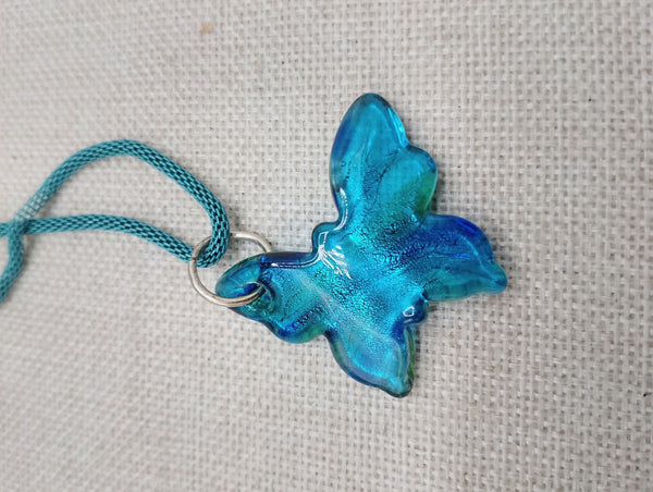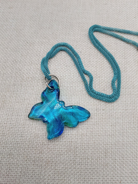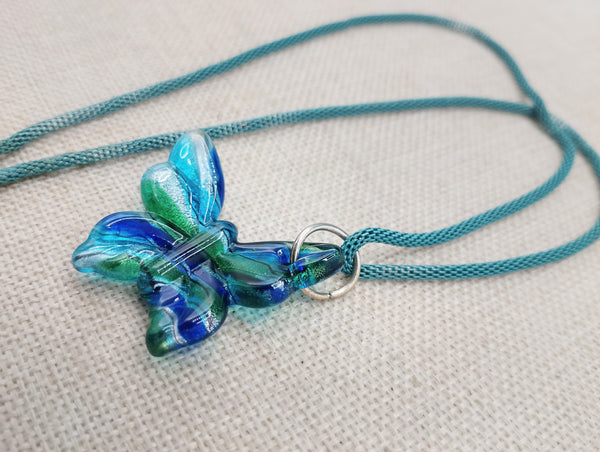 Introducing our stunning Women's Blue Murano Glass Pendant Green Butterfly Necklace. The butterfly, a symbol of transformation and joy, is captured in vibrant blues, greens, and silver. The thick pendant hangs from a unique metal mesh cord and closes with a clasp. Elevate any outfit with this beautiful piece. The necklace is 24 inches long with a unique mesh metal cord. The pendant is 2 x 1.5 inches. If you have any questions please feel free to contact us at anytime.