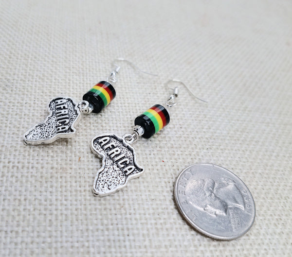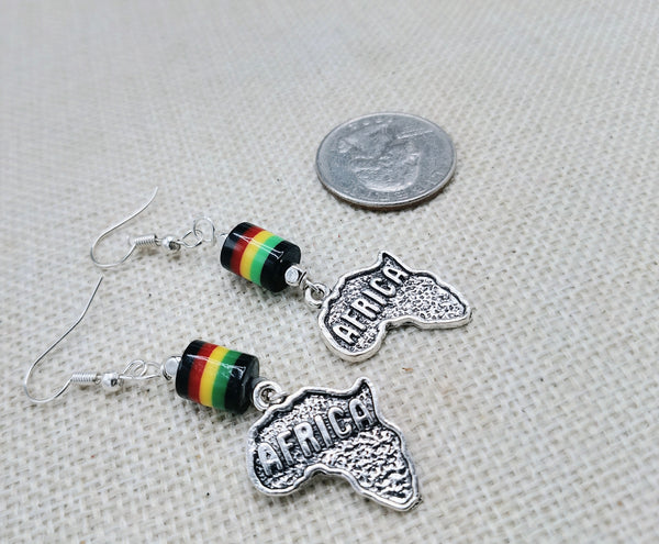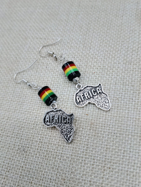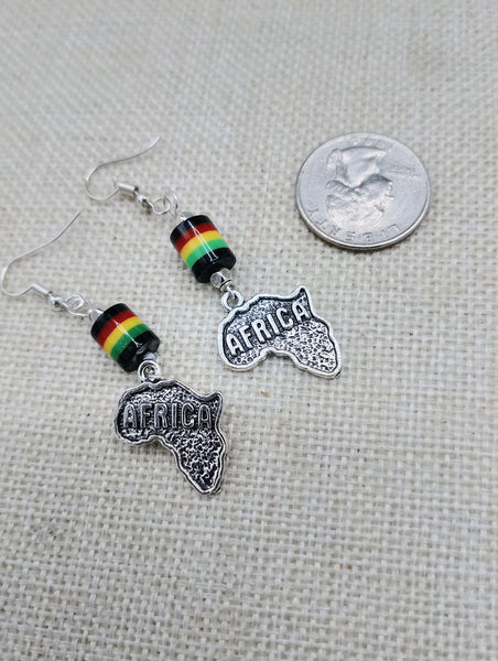 Expertly crafted with a silver pendant and vibrant Rasta bead, these Africa Earrings add a touch of cultural flair to any outfit. Measuring at approximately 2.5 inches long and complete with back stoppers, they offer both style and secure wearability. Contact us with any inquiries.