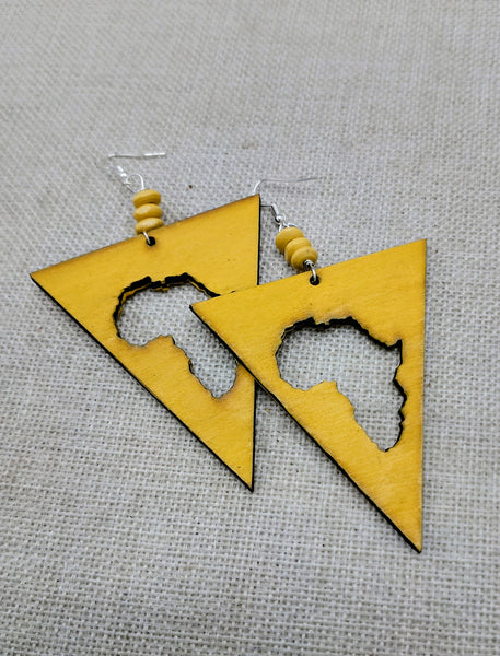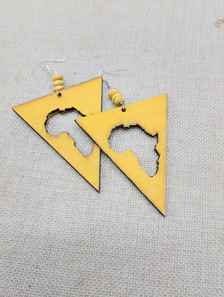Add an African-inspired touch to your wardrobe with these handcrafted wooden earrings. The triangular shape features a cutout of the African continent and measures 3 inches long, hanging approximately 4 inches in total. With back stoppers included, these earrings are not only stylish but also practical. Contact us with any questions.