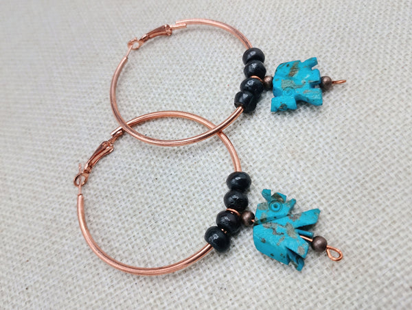 These elegant Copper Hoop Earrings, measuring 2 inches in diameter, feature a beautiful turquoise elephant bead dangle. Handcrafted with care and attention to detail, these ethnic-inspired earrings are the perfect addition to any jewelry collection. Stand out in style with these unique and eye-catching earrings.