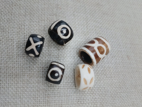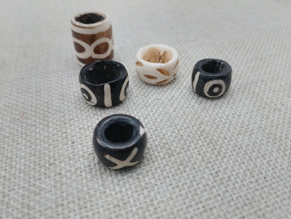The large hole hand carved big beads hair jewelry are unique. The holes are approximately 8 -10 mm. These can be used for braids, twist or locs. The shorter ones are approximately 1/2 of an inch and .75 of an inch long.   These can be added to locs, twist or braids. If you have any questions please feel free to contact us at anytime. Not machine made, there are natural imperfections.