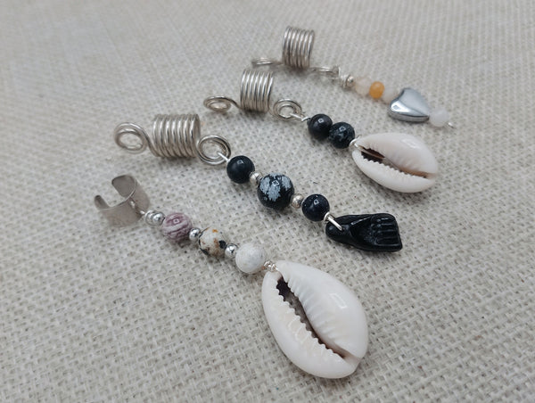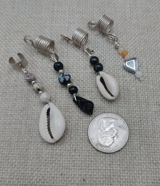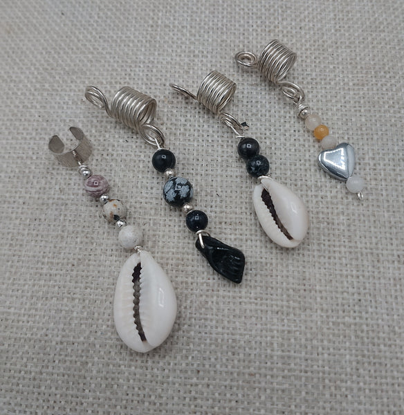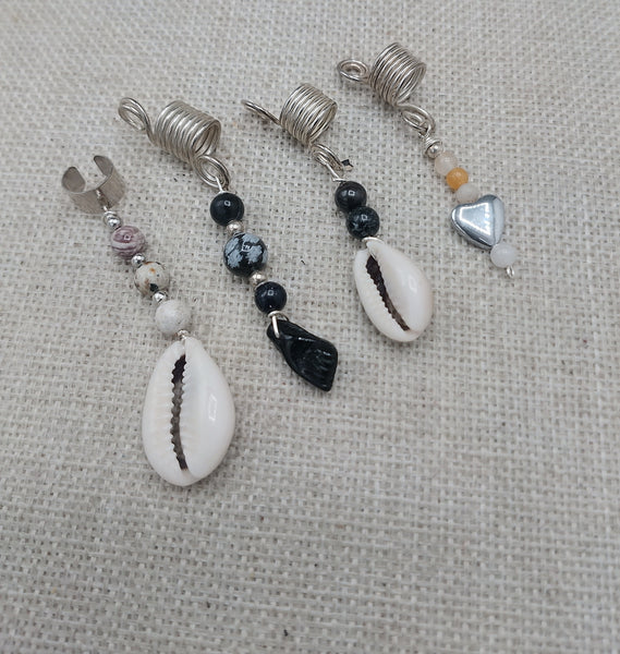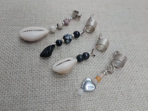 A set of unique 4 piece long hair jewelry. The piece is made with beautiful natural stones and charms. These can be added to twists, locs or braids. If you have any questions please feel free to contact us at anytime.