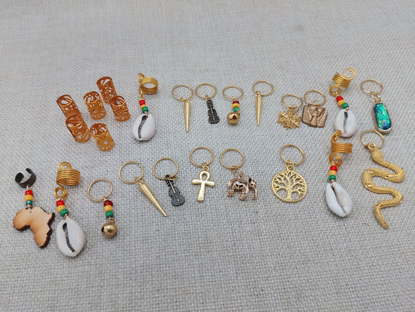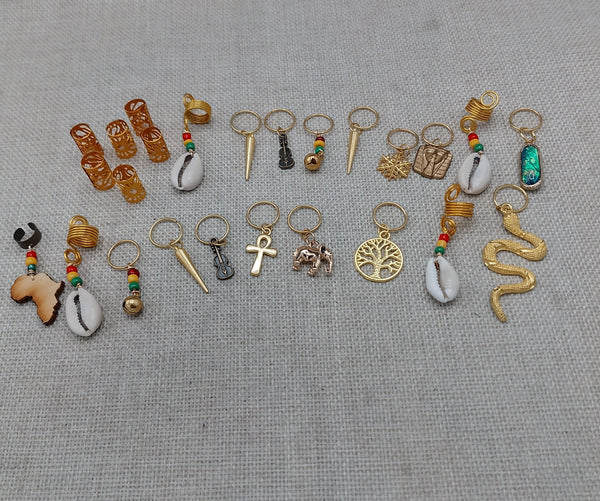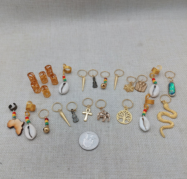 The hair jewelry comes in a set of 25. The pieces have a variety of pendants including a elephant, Ankh, Africa and cowries. They are as pictured. These can be added to twist, locs and braids. If you have any questions please feel free to contact us at anytime.