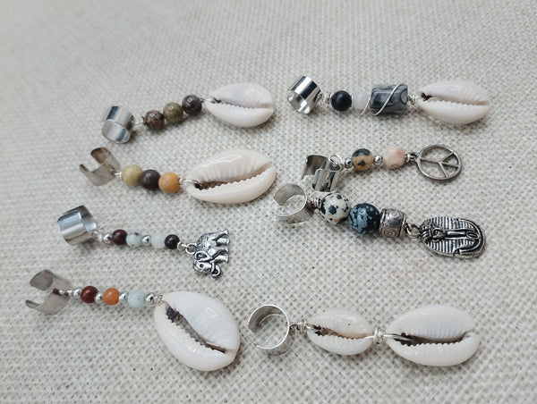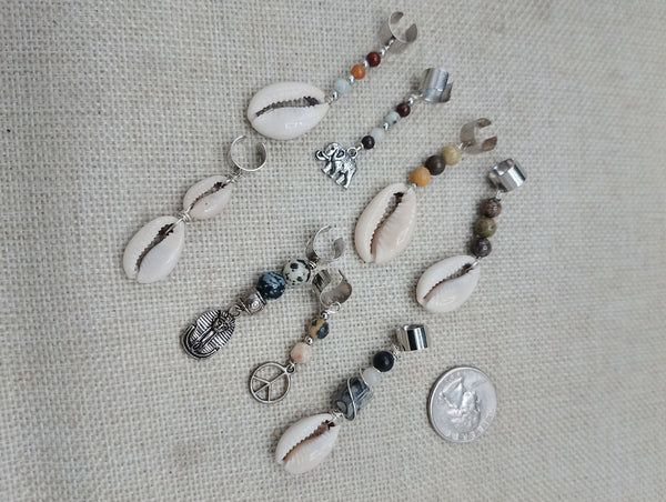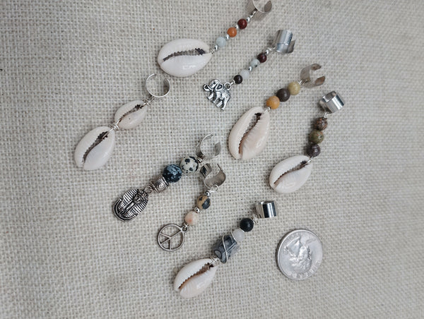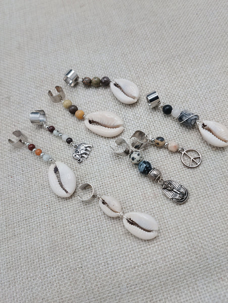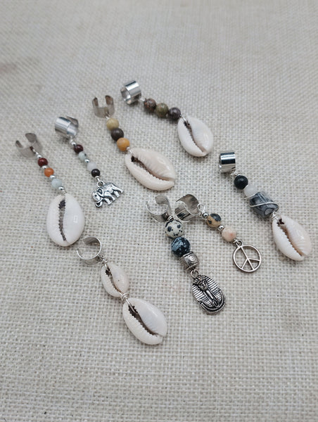Add a touch of unique beauty to your locs, twists, or braids with this set of 8 hair jewelry accessories. Made with natural stones and silver charms, these hair cuffs will elevate your hairstyle. Plus, they come with a contact option for any questions. Please note: choking hazard.