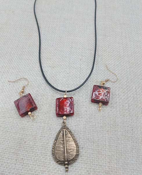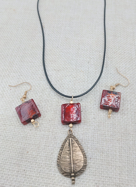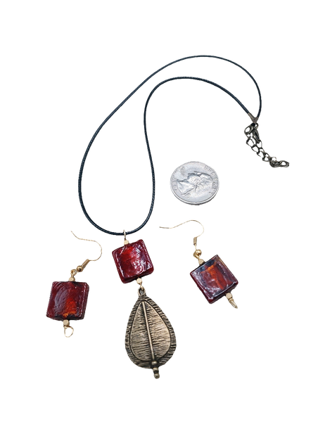 The jewelry is a beautiful necklace and earring matching set with amber glass. The earrings hangs approximately 1.5 inches long. The necklace is 18 inches long with the 2 inch pendant which includes the Murano glass cube with amber and gold inclusions with brass accents. Underneath sits the antique copper textured teardop. The necklace is 16 -18 inches with extension. If you have any questions please feel free to contact us at anytime.