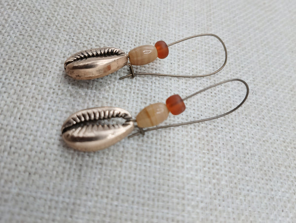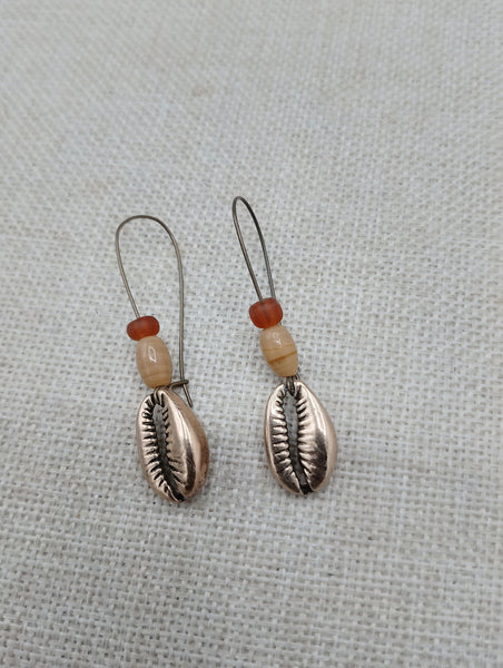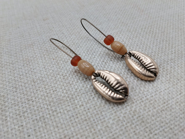 Cowrie Earrings Antique Gold Beaded Brown Long Women Jewelry