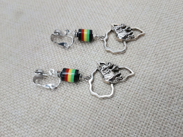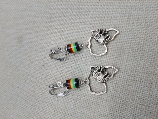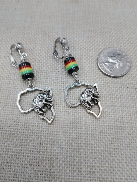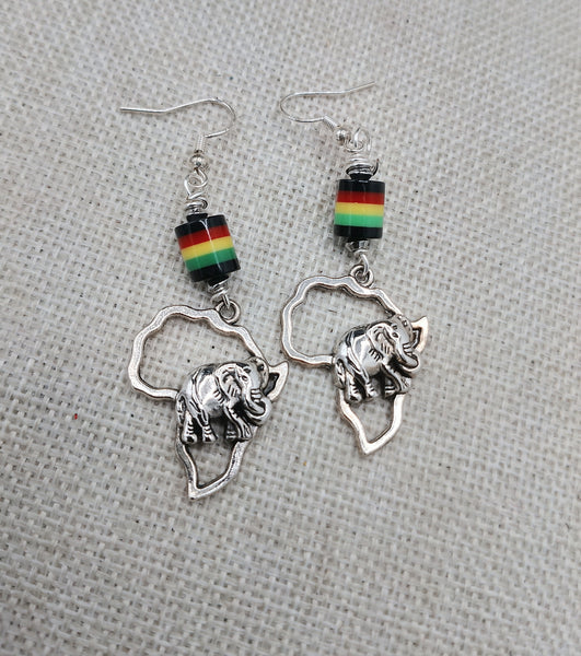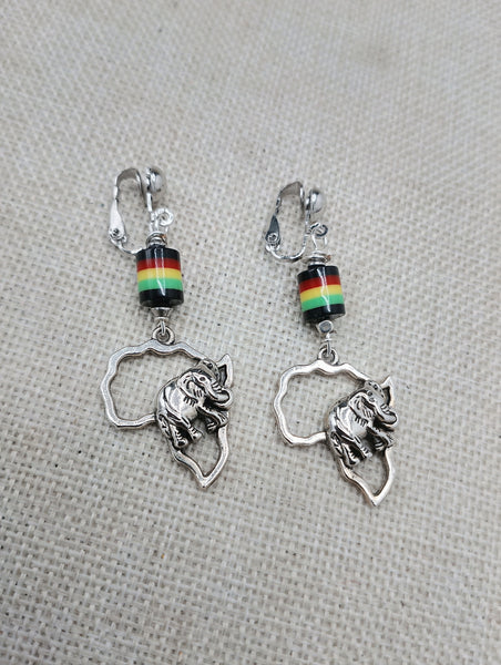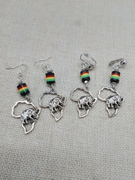 The silver earring are the shape of Africa with the elephant in the middle. The earrings are beaded with a rast bead. These are available in wire or clip on for non pierced options. If you have any questions please feel free to contact us at anytime.
