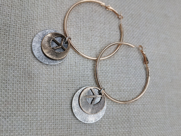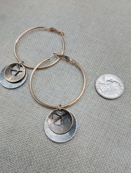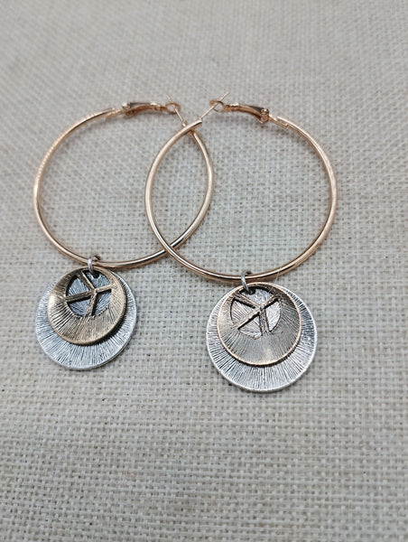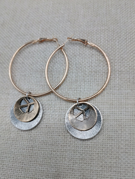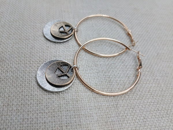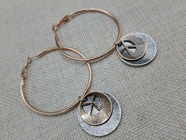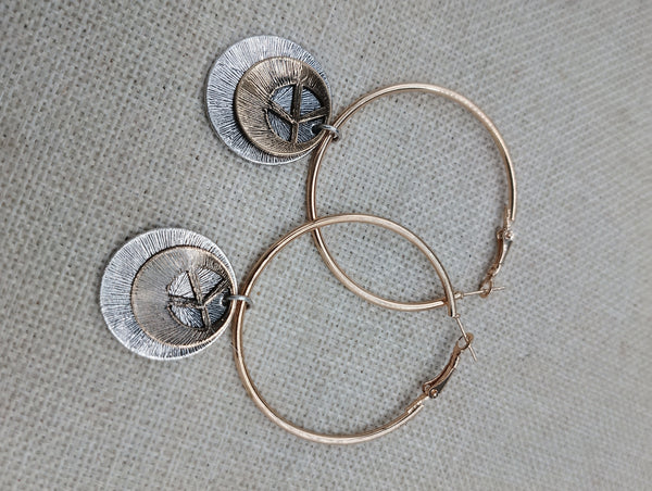 Elevate your style with our Peace Earrings Women Hoop Jewelry. These statement earrings hang 3 inches long and feature a 2 inch round hoop with antique silver and gold peace symbols. Crafted from stainless steel in a beautiful gold tone, these earrings make a perfect gift for yourself or a loved one.