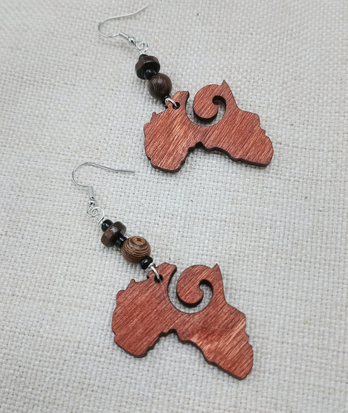 The Africa shaped wooden earrings with a swirl in the middle hang approximately 3 inches long with wire. The earrings are beaded with brown and black beads. The earrings are lightweight and coated for protection. Please keep from young ones as they may pose choking hazard. If you have any questions please feel free to contact us at anytime.