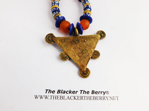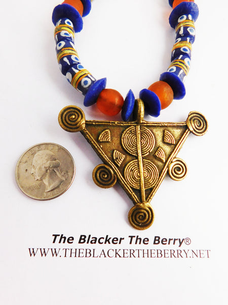 This bold necklace has rich colors like orange and blue. The handmade and hand painted African beads are a mix of glass, brass and wood on a leather cord. The triangle pendant was made in Ghana using a wax technique. The necklace is approximately 20 inches long and the pendant is 2 inches long.The closure is a easy button closure. If you have any questions please feel free to contact us at anytime.